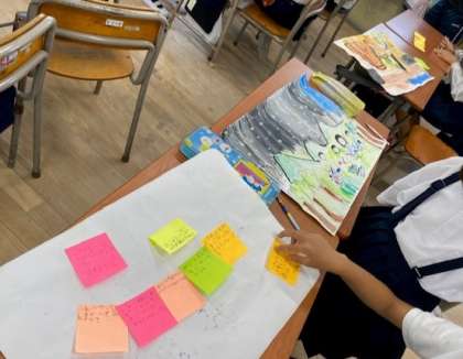 3年生では完成した図画をお互いに見合って、発見した良いところを付箋に書いて渡していました。