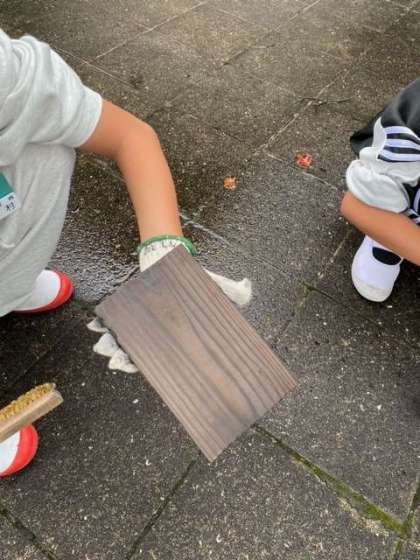 ?焦げ目のついた杉板をこすって、綺麗な木目が出てきたら、第一段階の完成です。その後は部屋で金具の取り付けにかかります。自然の家の方やカメラマンさんにもお手伝いいただいたり、友だちと協力して頑張っています。