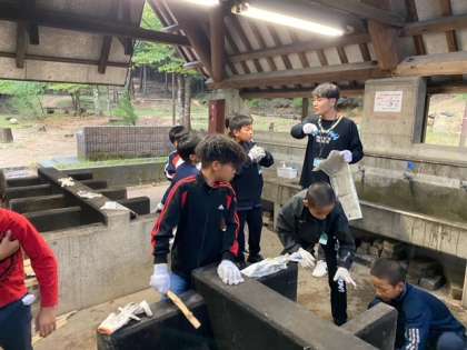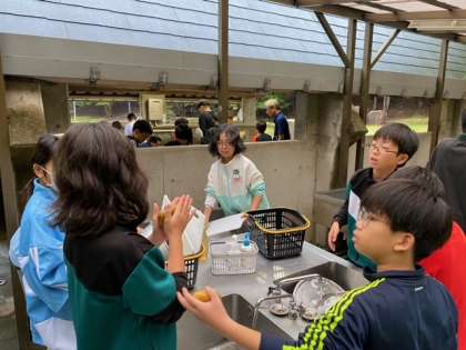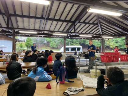 ?いよいよ飯盒炊さんに取り掛かりました。説明を聞いてからスタートです。雨天で使えるかまどが減ったため、2つの班が合同でカレーとご飯を炊いていますが、とても仲良く協力できています。