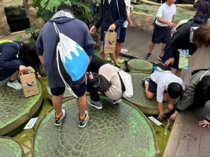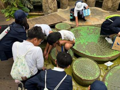 ふれあいコーナーのドクターフィッシュ(肌の角質を食べる魚。美容効果あり?)にみんな夢中です。