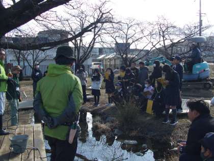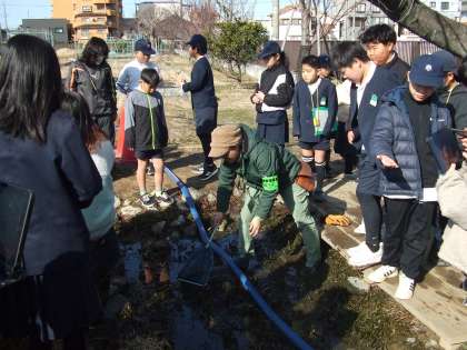 先週に5年生が1年間にわたって手入れしていたビオトープの整備作業と、業者の方に来ていただき、池の水を抜きつつ、植物や魚、幼虫などのレクチャーを受けました。寒さを乗り越え春を待つ生き物の姿に、新しい発見や学びを得ることができました。