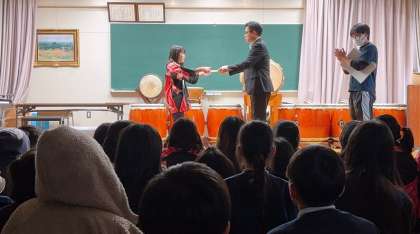 【太鼓クラブ 卒団式】 公開日 2025/03/07 更新日 2025/03/07 学校日記 3月6日が今年度の太鼓クラブの最終日でした。この日は6年生だけの編成で、クラブのメンバーや先生方、ご指導いただいた東雲先生の前で最後の太鼓演奏を披露しました。修了証書を手渡された後に、太鼓クラブへの思いを順番に話して、後輩に後を託していました。 いいね(0)