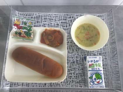 煮こみハンバーグ、コーンスープ、豆こんぶです。