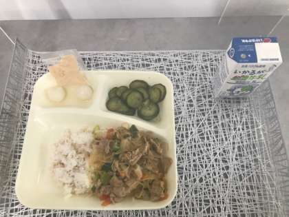 豚丼、きゅうりのかつお梅風味、白玉だんごてす。