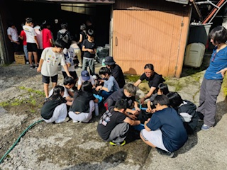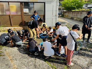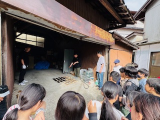 焼き板をたわしで擦って綺麗に磨き上げています。みんな集中しています。