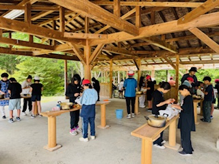 子どもたちが楽しみにしていたカレー作りがスタートしました。米とぎや野菜切りに苦戦しています。
