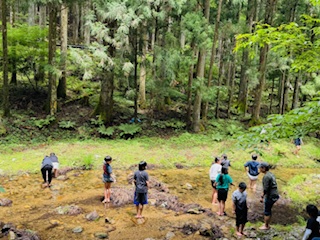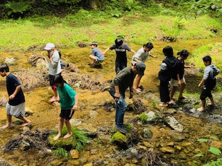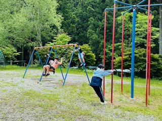 カレーを早く食べ終わったので、遊具で遊んだり、川遊びをしたりしました。