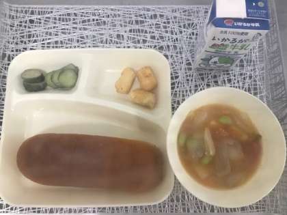 いかてんぷら、フレッシュトマトのスープ煮、きゅうりのバジル風味サラダです。