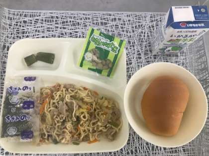 和風焼きそば、オクラのかつお梅風味、まっ茶大豆です。