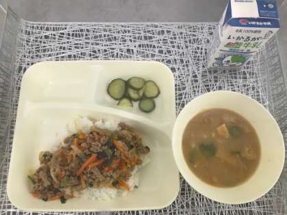 今日の給食 公開日 2025/06/24 更新日 2025/06/24 学校日記 豚ひき肉とにらのそぼろ丼、みそ汁、きゅうりのゆず風味です。 今日のみそ汁は、にぼしからとっただしを使っています。 3年生の給食のようすです。 いいね(0)