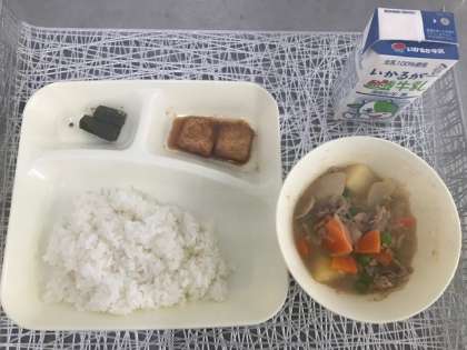 みそ肉じゃが、あつあげのしょうがじょうゆかけ、オクラのおかかいためです。