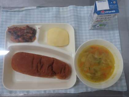 なすのミートグラタン、鶏肉とキャベツのスープ、りんごです。