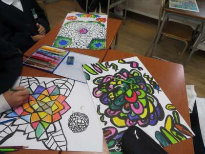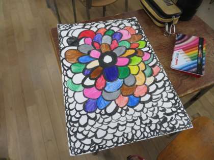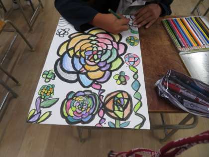 墨で花を描いて色鉛筆で色を塗っていきます。