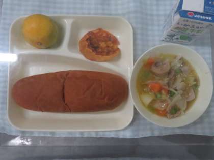 豚肉と野菜のスープ煮、変わりピザ、みかんです。