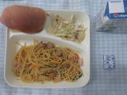 ウインナーときのこの和風スパゲッティ、きざみのり、焼きツナキャベツ、固形チーズです。