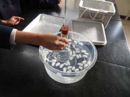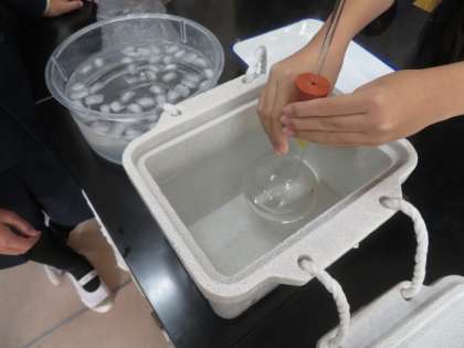 フラスコの中の空気を温めたり冷やしたりした時のガラス管の中のゼリーのようすを調べました。