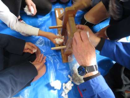12/4 4年布づくり1 公開日 2025/12/04 更新日 2025/12/04 4年生 クラフトパークさんに来ていただいて布づくりを体験しました。 綿から糸を作って、織機で布を作っていきます。 いいね(0)