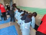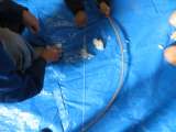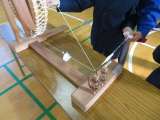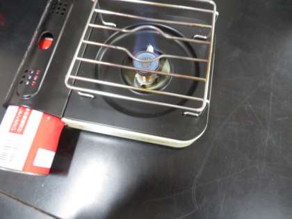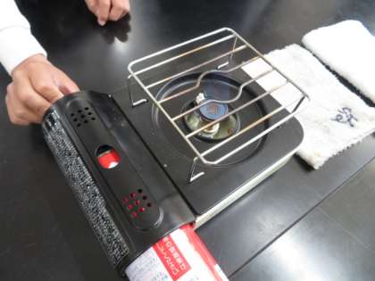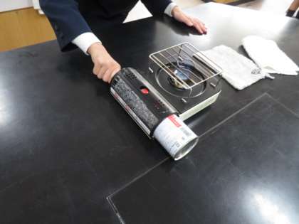 理科室でガスコンロにガスボンベを取り付け、つまみを回して火をつけて消しました。