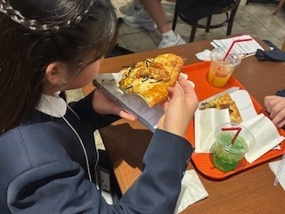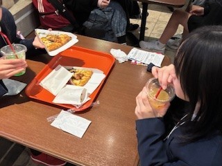 ピザに手作りデザート。おいしく昼食をいただいています。