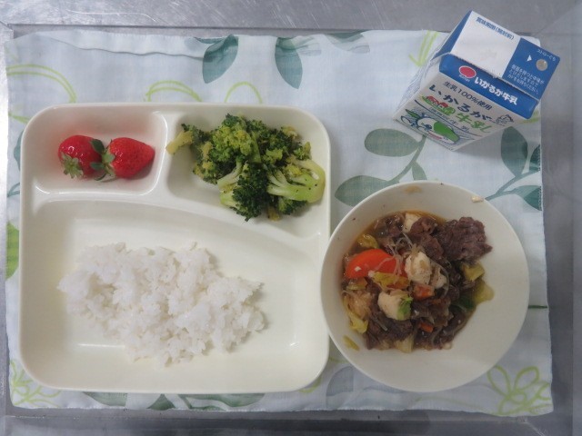 すき焼き煮、ブロッコリーのしょうがづけ、いちごです。