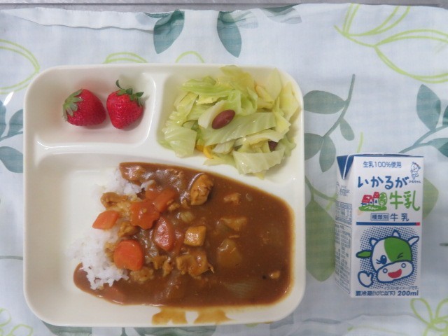 3/5 今日の給食 公開日 2026/03/05 更新日 2026/03/05 学校日記 チキンカレーライス、金時豆と野菜のサラダ、いちごです。子どもたちは、チキンカレーライスが大好きです。 いいね(1)