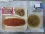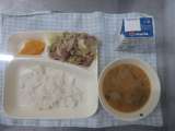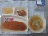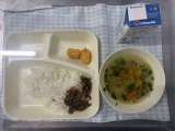 豚肉と野菜のソテー、スープ、スイートポテトです。 今日の給食のスープには、鶏肉・...