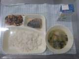 さごしのごまじょうゆかけ、五目汁、大豆の煮ものです。 さごしは、さわらの成長段階...