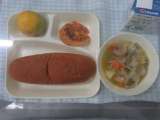 豚肉と野菜のスープ煮、変わりピザ、みかんです。 今日の給食のみかんは、熊本県産で...