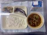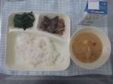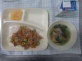 ピリ辛丼、中華スープ、白桃です。 11月の最後の給食となりました。 今日の給食の...