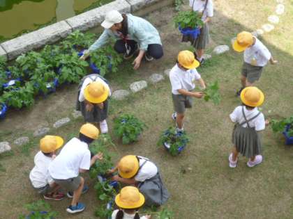 1年生が朝顔の観察をしていました。葉も大きくなり、数も増えて子どもたちはとてもうれしそうにしていました。「葉の数が〇まいだった。」「葉が自分の手と同じくらいだった。」という感想も聞かれました。