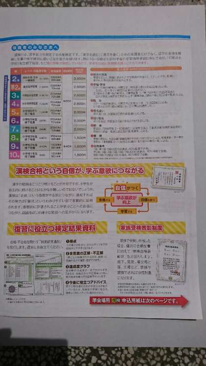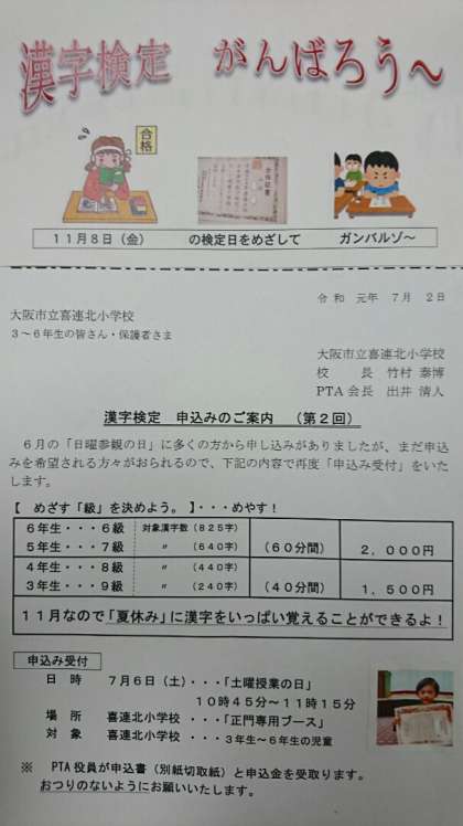 PTA役員の方々のご協力により、漢字検定 第2回の申込み受付をしていただくことになりました。6月の受付終了後、希望される方々がおられるので 7月6日(土)に受付していただけます。本日、ご案内をお配りいたしました。申込書がない場合は、受付場所でご用意されるとのことです。なるべく、おつりのないようにとのことです。