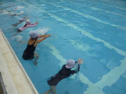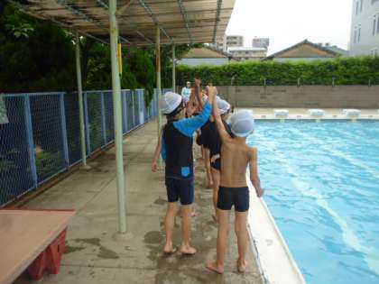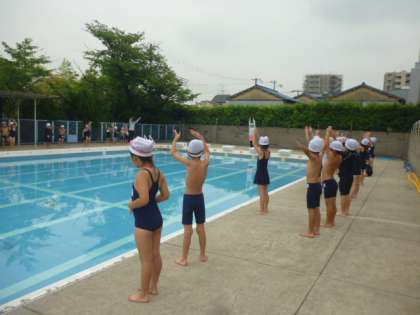 プール学習の様子です。気温はそれほど高くないですが、子どもたちはとても気持ちようさそうにプールに励んでいます!