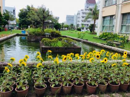 中庭のひまわりは、今朝の雨で潤って元気に咲いています。