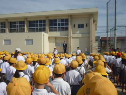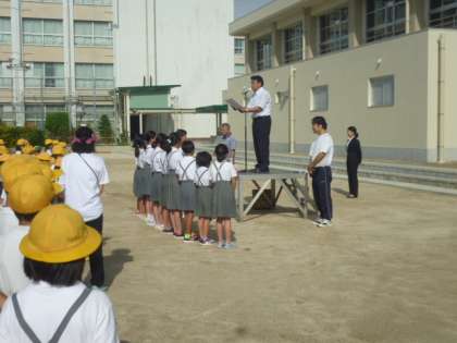 9月2日(月)、児童朝会の様子です。キックベースボールの表彰がありました。また、今週からの教育実習生の紹介がありました。1ヵ月間、1年1組の学級で過ごします。