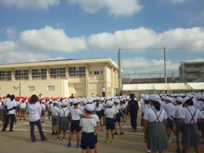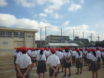 9月9日(月)、児童朝会の様子です。運動会の並び方の練習をしました。今週の当番の先生から、「進んであいさつをしよう。」という週目標が伝えられました。暑い日が続いていますが、元気のよいあいさつで一日明るく過ごしてほしいです!