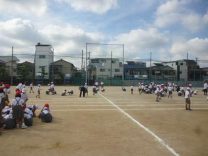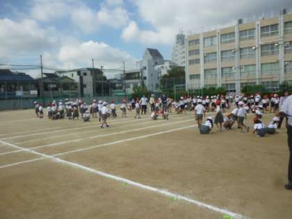 児童朝会後に、全校児童で運動会にむけて運動場の石を拾いました。、子どもたちは大きな石を見つけて拾っていました。