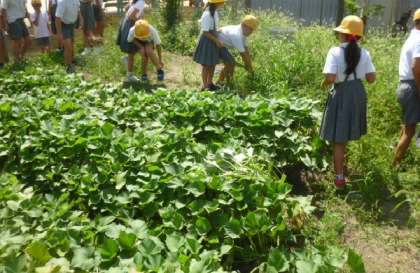 2年生がさつまいも畑の雑草を一生懸命抜いていました。夏休みの間に、葉も大きく、雑草ものびていて、子どもたちがとても驚いていました!