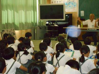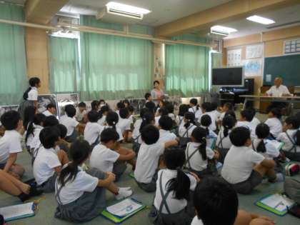 戦時中・戦後の苦しい生活や空襲が起こって焼夷弾によって焼かれた大阪の町の様子、B29の飛行機が空を当たり前のように毎日飛行していたことなど、たくさんの話を聞きました。特に、道に生えている草を乾燥させて粉にし、せんべいにして食べていたことには、子どもたちはとても驚いていました。