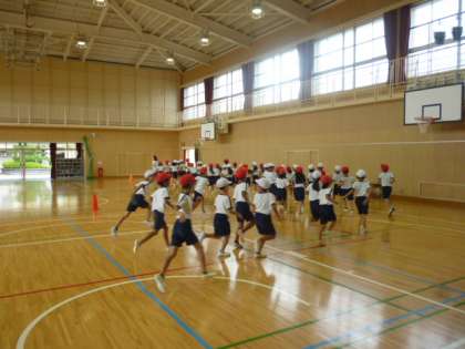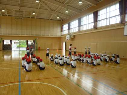 2年生の練習の様子です。徒競走、大玉ころがしの入退場の練習をしていました。