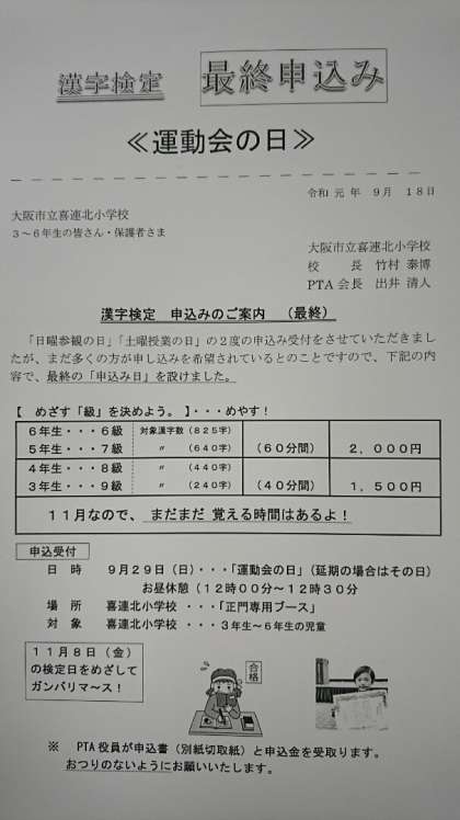 PTAの方々により、漢字検定 最終申込みの日が決まりました。受検を希望されていたにもかかわらず、過去2度の受付ができなかった方は、運動会の日のお昼休憩時に受付ブースが開設されますので、お知らせいたします。