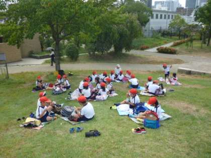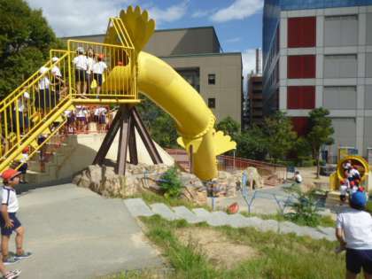 キッズプラザで遊んだ後は扇町公園で、昼食をとりました。美味しいお弁当、たくさんのおやつに子どもたちは喜んで食べていました。昼食後は、公園内のすべり台で楽しく遊びました。