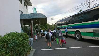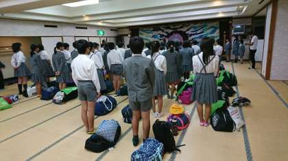 16:23 宿舎に到着しました。広間で開舎式をしました。
