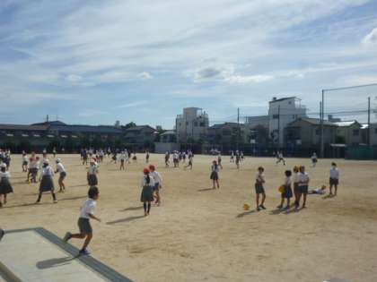 休み時間の様子です。過ごしやすい気温で、子どもたちは元気に運動場で遊んでいます。始業のチャイムを聞くと、すぐに教室に戻ることができています。