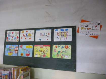 3年生の学年掲示板の様子です。「What am I 〜ローマ字でかいてみよう〜」という題で、自分の名前をローマ字で書き、きれいに色を塗ることができています。