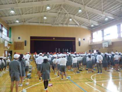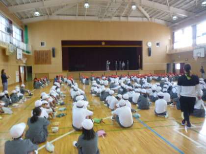 10月31日(木)、児童集会の様子です。たてわり班にわかれて、伝言ゲームをしました。久しぶりのたてわり班活動でした。