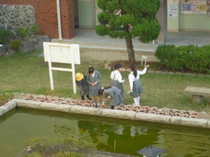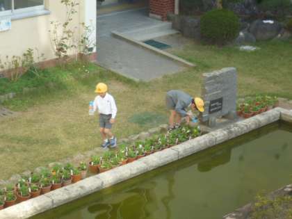 ふれあい花いっぱい活動で植えた花に水やりをしています。早く花が咲くといいですね。