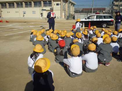 11月13日(水)に交通安全指導を行いました。警察署の方に来ていただき、道路標識や信号機の色の意味について考えました。最後は一人ずつ左右の安全確認をして歩く練習をしました。クイズ形式で様々なことを教えていただいたので、楽しんで学習することができました。