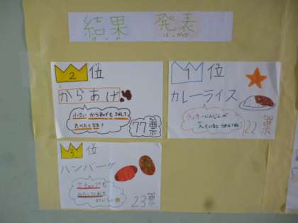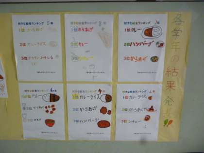 給食委員会の児童が、全校児童に「好きな給食」のアンケートをとり、集計をしてくれました。結果が給食室前の廊下に掲示してあります。とても分かりやすくまとめられており、子どもたちも楽しく読んでいました。