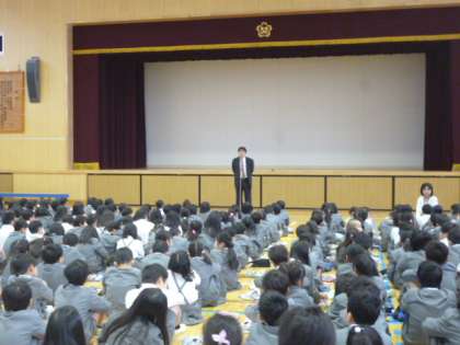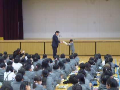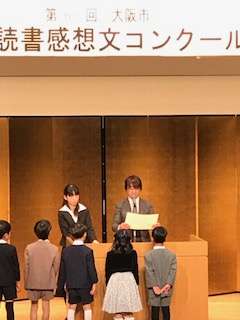 12月1日(日)に大阪市立中央図書館で第65回大阪市青少年読書感想文コンクールの表彰式がありました。今年度は、喜連北小学校から1年生の児童が「大阪市学校図書館協議会長賞」に見事!選ばれました。表彰式の様子と、2日(月)の朝会で校長先生から賞状をもらっている様子です。