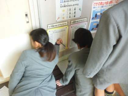 今日の清潔調べの結果です。ハンカチ・ティッシュ・コップ・良い爪状態などの確認項目で、1個の忘れ物が2位になっています。